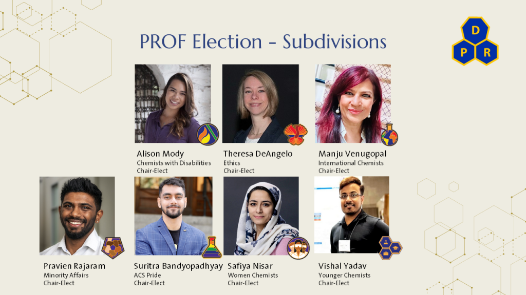 Elections have closed, and thank you to all those who ran in this year’s elections. We are proud to announce the thirteen newly elected officers who will serve the ACS Division of Professional Relations. Find more about each person and their elected role below.
